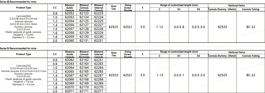 For Series III, the guide cannula-double has the specification and outer diameter of 26 G and0.48 mm respectively, suitable for mice.