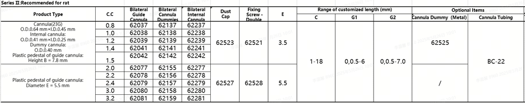 For Series II, the guide cannula-double has the specification and outer diameter of 23 G and 0.64mm respectively, suitable for rat.