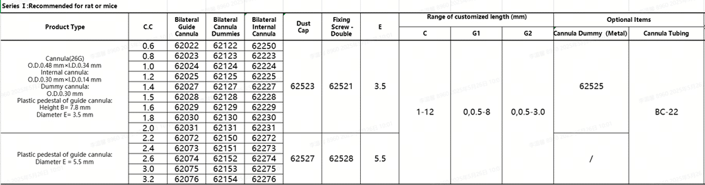 For Series I, the guide cannula-double has the specification and outer diameter of 26 G and 0.48mm respectively, suitable for both rat and mice.